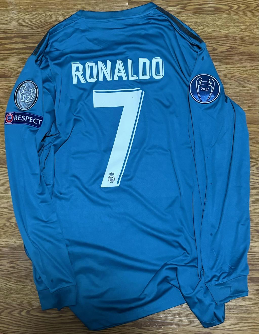 This jersey is an authentic tribute to the 2017/18 season, a campaign that saw Real Madrid secure an unprecedented third consecutive UEFA Champions League title. Worn during the journey to the "Decimotercera," this sleek blue kit with turquoise accents became synonymous with Cristiano Ronaldo's aerial brilliance—including the legendary bicycle kick against Juventus. This was Ronaldo's final season in the iconic white and blue, where he finished as the UCL top scorer for the sixth year in a row.